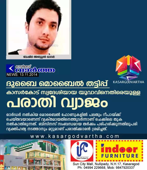 ദുബൈ: (www.kasargodvartha.com 13.11.2014) ദുബൈയില്‍ മലയാളിയുടെ ഉടമസ്ഥതയിലുള്ള മൊബൈല്‍ ഫോണ്‍ മൊത്തക്കച്ചവട സ്ഥാപനത്തില്‍നിന്ന് ലക്ഷക്കണക്കിന് ദിര്‍ഹത്തിന്റെ തട്ടിപ്പ് നടത്തി കടന്നുകളഞ്ഞു എന്ന പരാതി വ്യാജമാണെന്ന് കാസര്‍കോട് ആലംപാടി സ്വദേശിയും മോഡസ്റ്റ് ഗ്രൂപ്പ് ചെയര്‍മാനുമായ ബഷീര്‍ അബ്ദുല്‍ ഖാദര്‍ അറിയിച്ചു.