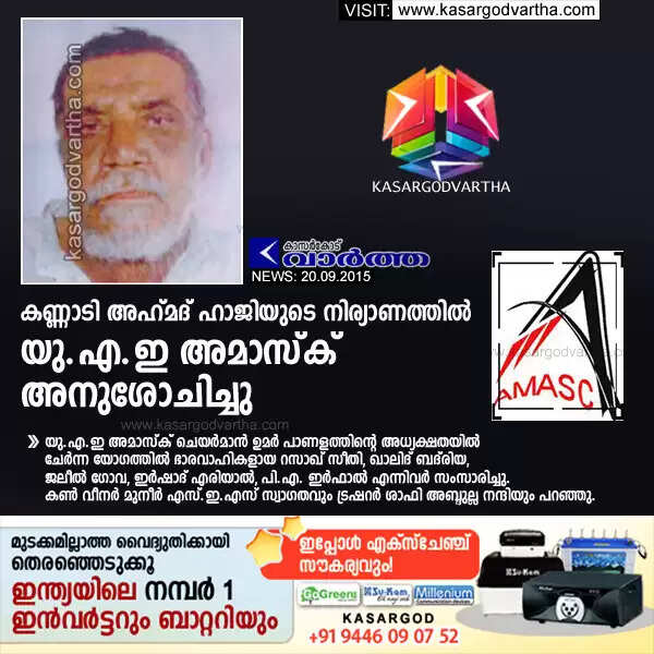 ദുബൈ: (www.kasargodvartha.com 19/09/2015) സന്തോഷ് നഗറിലെ പഴയകാല പ്രവാസിയും സാമൂഹ്യ പ്രവര്ത്തകനുമായ കണ്ണാടി അഹ്മദ് ഹാജിയുടെ വിയോഗത്തില് യു.എ.ഇ അമാസ്ക് കമ്മിറ്റി അനുശോചിച്ചു. യു.എ.ഇ അമാസ്ക് ചെയര് മാന് ഉമര് പാണളത്തിന്റെ അധ്യക്ഷതയില് ചേര്ന്ന യോഗത്തില് ഭാരവാഹികളായ റസാഖ് സീതി, ഖാലിദ് ബദ്രിയ, ജലീല് ഗോവ, ഇര്ഷാദ് എരിയാല്, പി.എ. ഇര്ഫാല് എന്നിവര് സംസാരിച്ചു.