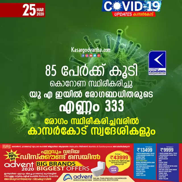 85 പേര്ക്ക് കൂടി കൊറോണ സ്ഥിരീകരിച്ചു; യു എ ഇയില് രോഗബാധിതരുടെ എണ്ണം 333, രോഗം സ്ഥിരീകരിച്ചവരില് കാസര്കോട് സ്വദേശികളും