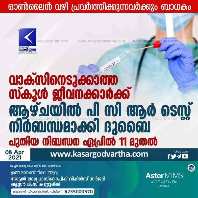 വാക്സിനെടുക്കാത്ത സ്കൂള് ജീവനക്കാര്ക്ക് ആഴ്ചയില് പി സി ആര് ടെസ്റ്റ് നിര്ബന്ധമാക്കി ദുബൈ; പുതിയ നിബന്ധന ഏപ്രില് 11 മുതല്