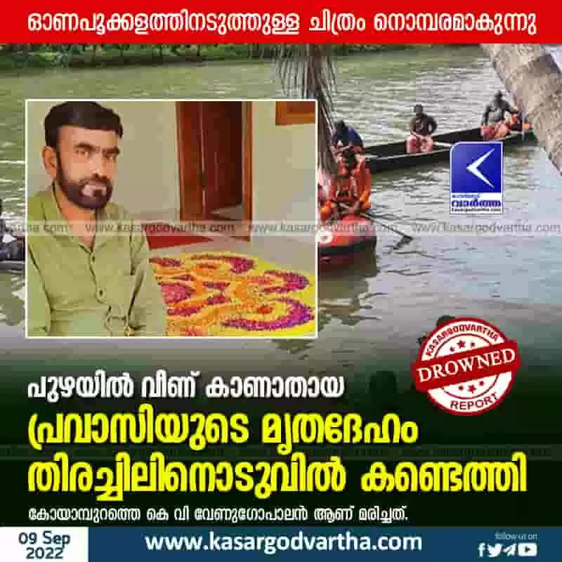 ഒരാള് പുഴയില് വീഴുന്നത് രണ്ട് യുവാക്കള് കണ്ടിരുന്നു. പുഴക്കരയില് നിന്നും, ഓണ്ലൈനില് നിന്നും വാങ്ങിയ വേണുഗോപാലന്റെ ചെരുപ്പ് കണ്ടാണ് കാണാതായത് വേണുഗോപാലനെന്ന് തിരിച്ചറിഞ്ഞത്. ഓണ ദിവസം പൂക്കളം തീര്ത്തതിന്റെ ചിത്രങ്ങള് ഇപ്പോള് നൊമ്പരമാവുകയാണ്. ഓണനാളിലെ വേണുഗോപലന്റെ ആകസ്മിക മരണം ഇപ്പോളും വീട്ടുകാര്ക്കും ബന്ധുകള്ക്കും വിശ്വസിക്കാനാകുന്നില്ല.