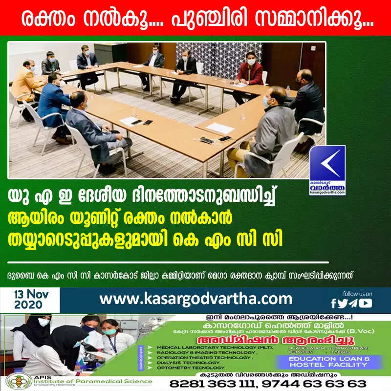 രക്തം നല്കൂ.... പുഞ്ചിരി സമ്മാനിക്കൂ... യു എ ഇ ദേശീയ ദിനത്തോടനുബന്ധിച്ച് ആയിരം യൂണിറ്റ് രക്തം നല്കാന് തയ്യാറെടുപ്പുകളുമായി കെ എം സി സി