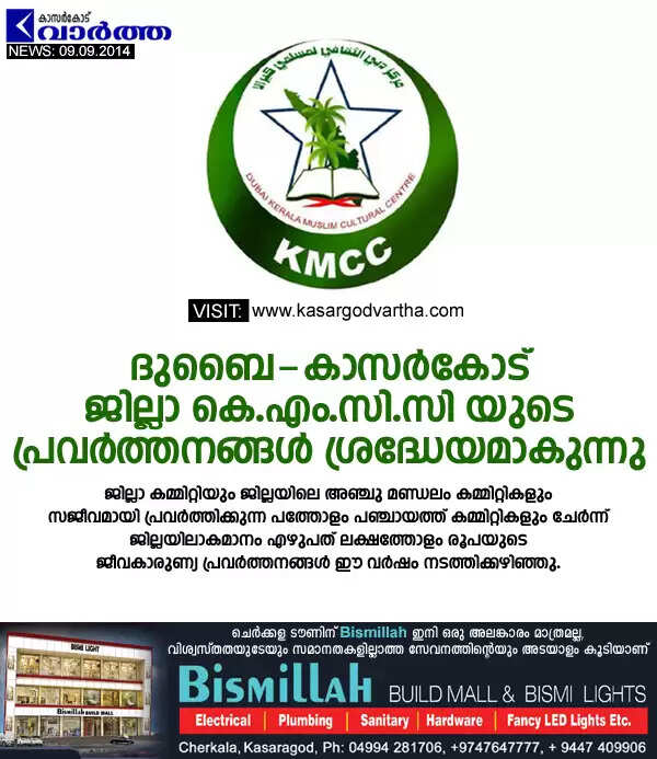 ദുബൈ: (www.kasargodvartha.com 09.09.2014) ജീവ കാരുണ്യ സേവന രംഗങ്ങളില് ദുബൈ കെ.എം.സി.സി കാസര്കോട് ജില്ലാ കമ്മിറ്റിയുടെയും കീഴ്ഘടകങ്ങളുടേയും പ്രവര്ത്തനങ്ങള് ശ്രദ്ധേയമാകുന്നു. വൈവിധ്യമാര്ന്ന സഹായ സേവന പ്രവര്ത്തനങ്ങളും ജന പങ്കാളിത്തവും കൊണ്ടു കെ.എം.സി.സി പരിപാടികള് വ്യത്യസ്തത പുലര്ത്തുന്നു. ജില്ലാ കമ്മിറ്റിയും ജില്ലയിലെ അഞ്ചു മണ്ഡലം കമ്മിറ്റികളും സജീവമായി പ്രവര്ത്തിക്കുന്ന പത്തോളം പഞ്ചായത്ത് കമ്മിറ്റികളും ചേര്ന്ന് ജില്ലയിലാകമാനം എഴുപത് ലക്ഷത്തോളം രൂപയുടെ ജീവകാരുണ്യ പ്രവര്ത്തനങ്ങള് ഈ വര്ഷം നടത്തിക്കഴിഞ്ഞു.