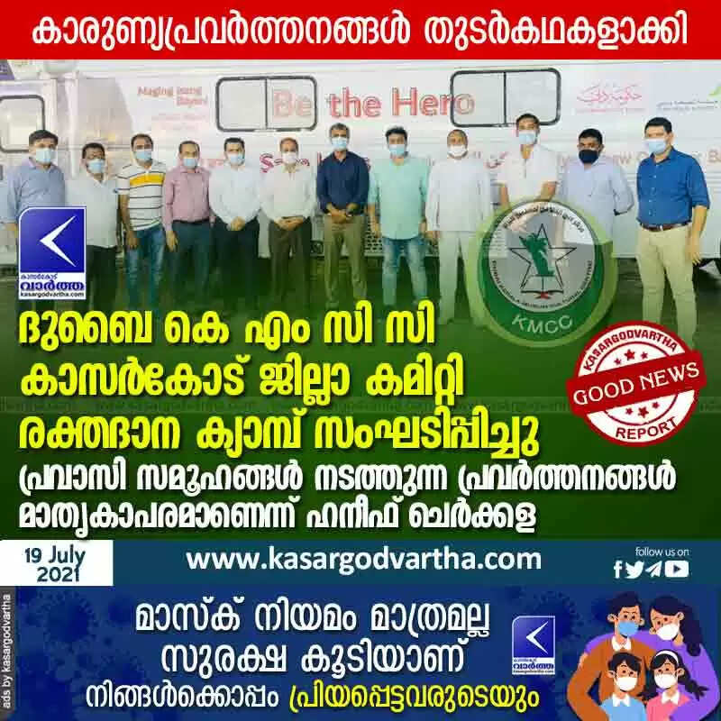 ദുബൈ കെ എം സി സി കാസർകോട് ജില്ലാ കമിറ്റി രക്തദാന ക്യാമ്പ് സംഘടിപ്പിച്ചു; പ്രവാസി സമൂഹങ്ങൾ നടത്തുന്ന പ്രവർത്തനങ്ങൾ മാതൃകാപരമാണെന്ന് ഹനീഫ് ചെർക്കള
