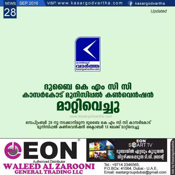 ദുബൈ കെ എം സി സി കാസര്കോട് മുനിസിപ്പല് കണ്വെന്ഷന് മാറ്റിവെച്ചു