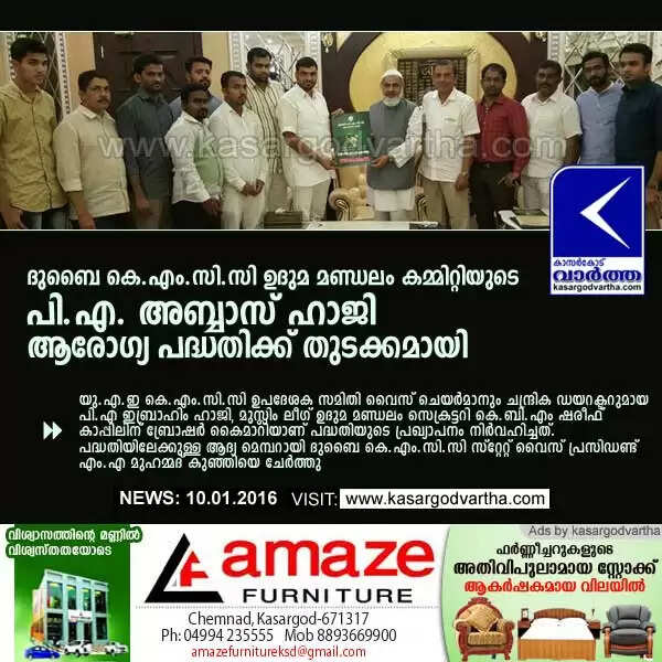 ദുബൈ കെ.എം.സി.സി ഉദുമ മണ്ഡലം കമ്മിറ്റിയുടെ പി.എ. അബ്ബാസ് ഹാജി ആരോഗ്യ പദ്ധതിക്ക് തുടക്കമായി