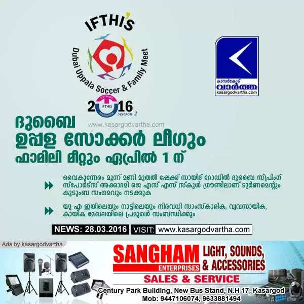 ദുബൈ: (www.kasargodvartha.com 28/03/2016) ഉപ്പള സോക്കര് ആന്ഡ് ഫാമിലി മീറ്റിന്റെ രണ്ടാമത് കുടുംബ സംഗമവും ഫുട്ബാള് മത്സരവും എപ്രില് ഒന്നിന് വൈകുന്നേരം മൂന്ന് മണി മുതല് ഗള്ഫ് ന്യൂസിന് സമീപം, ഷേക്ക് സായിദ് റോഡില് ദുബൈ സ്പ്രിംഗ് സ്പോര്ട്സ് അക്കാദമി ജെ എസ് എസ് സ്കൂള് ഗ്രൗണ്ടില് നടക്കും. യു എ ഇയിലെ എല്ലാ എമിറേറ്റ്സില് നിന്നും മംഗല്പാടി പഞ്ചായത്തില് പെട്ട എല്ലാവരേയും ഒരേ കുടക്കീഴില് കുടുംബ സമേതം കണ്ടു മുട്ടാനും സൗഹൃദം പങ്ക് വെക്കാനുമുള്ള അതിവിപുലമായ വേദിയാണ് ഒരുക്കിയിരിക്കുന്നത്.