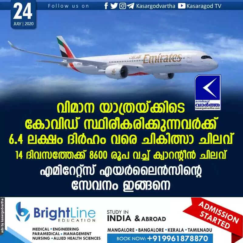 വിമാന യാത്രയ്ക്കിടെ കോവിഡ് സ്ഥിരീകരിക്കുന്നവര്‍ക്ക് 6.4 ലക്ഷം ദിര്‍ഹം വരെ ചികിത്സാ ചിലവ്; 14 ദിവസത്തേക്ക് 8600 രൂപ വച്ച് ക്വാറന്റീന്‍ ചിലവ്; എമിറേറ്റ്‌സ് എയര്‍ലൈന്‍സിന്റെ സേവനം ഇങ്ങനെ