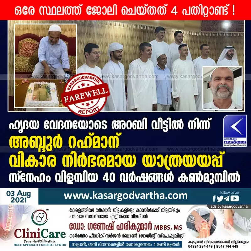 അബുദബി: (www.kasargodvartha.com 03.08.2021) വീട്ടിലെ ഒരംഗം വേർപിരിയുന്ന ഹൃദയ വേദനയോടെയാണ് അറബി കുടുംബം കാസർകോട്ടുകാരനായ അബ്ദുർ റഹ്മാനെ യാത്രയാക്കിയത്. കേക് മുറിച്ചും സമ്മാനങ്ങൾ കൈമാറിയും അവർ സ്നേഹവായ്പകൾ ചൊരിഞ്ഞു. അബ്ദുർ റഹ്മാനെ ആ കുടുംബത്തിന് അത്രമേൽ പ്രിയമാക്കിയത് അദ്ദേഹത്തിന്റെ നീണ്ട കാലത്തെ സേവനമായിരുന്നു. ഒന്നും രണ്ടുമല്ല, 40 വർഷമാണ് അബ്ദുർ റഹ്മാൻ ആ കുടുംബത്തിൽ ഹൗസ് ഡ്രൈവറായി ജോലി ചെയ്തത്. 17–ാം വയസിൽ യു എ ഇയിലെത്തിയ അബ്ദുർ റഹ്മാന് ഇപ്പോൾ പ്രായം 64.
