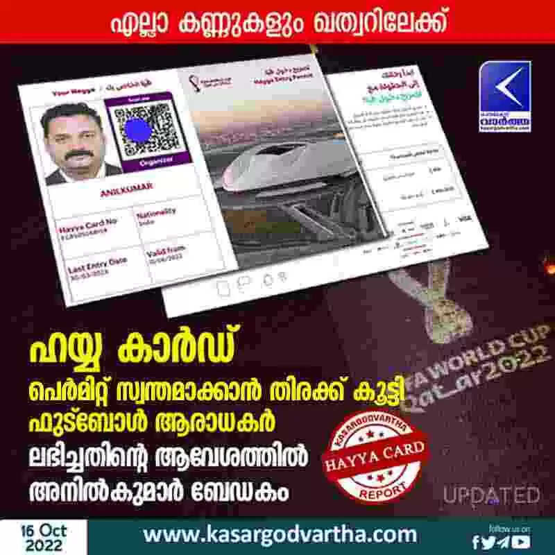 കാസർകോട് അരമന ആശുപത്രി അഡ്മിനിട്രേറ്ററും ബേഡകം സ്വദേശിയുമായ അനിൽ കുമാറും ഹയ്യ കാർഡ് പെർമിറ്റ് ലഭിച്ചതിന്റെ സന്തോഷത്തിലാണ്. ലോകത്തിലെ തന്നെ പ്രധാനപ്പെട്ട ഒരു ടൂർണമെന്റിൽ നേരിട്ട് പങ്കെടുക്കാനാവുന്നത് വലിയ സന്തോഷം പകരുന്നതായി അദ്ദേഹം കാസർകോട് വാർത്തയോട് പറഞ്ഞു. അനിൽ കുമാർ നേരത്തെ വിവിധ ഗൾഫ് രാജ്യങ്ങളിൽ ജോലി ചെയ്തിരുന്നു. ഇത്തവണ ഫുട്‍ബോൾ മത്സരം കാണാൻ വീണ്ടുമൊരിക്കൽ കൂടി അറേബ്യൻ മണലാരണ്യത്തിലേക്ക് പറക്കുന്നതിന്റെ ആവേശത്തിലാണ് അദ്ദേഹം.