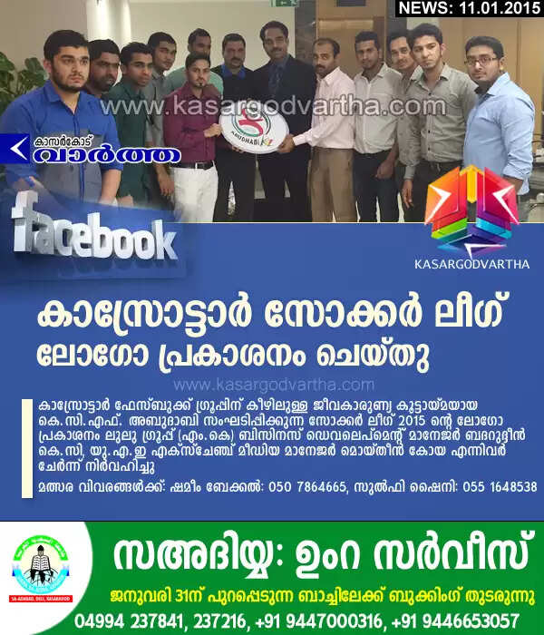 ദുബൈ: (www.kasargodvartha.com 11/01/2015)കാസ്രോട്ടാര് ഫേസ്ബുക്ക് ഗ്രൂപ്പിന് കീഴിലുള്ള ജീവകാരുണ്യ കൂട്ടായ്മയായ കെ.സി.എഫ്. അബുദാബി സംഘടിപ്പിക്കുന്ന സോക്കര് ലീഗ് 2015 ന്റെ ലോഗോ പ്രകാശനം ചെയ്തു. ലുലു ഗ്രൂപ്പ് (എം.കെ) ബിസിനസ് ഡെവലെപ്മെന്റ് മാനേജര് ബദറുദ്ദീന് കെ.സി, യു.എ.ഇ എക്സ്ചേഞ്ച് മീഡിയ മാനേജര് മൊയ്തീന് കോയ എന്നിവര് ചേര്ന്നാണ് പ്രകാശന കര്മം നിര്വഹിച്ചത്.