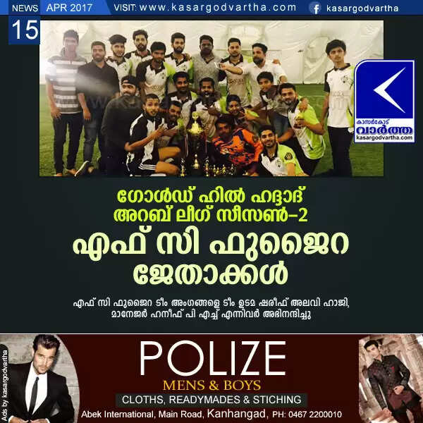ദുബൈ: (www.kasargodvartha.com 15.04.2017) ഗോള്ഡ് ഹില് ഹദ്ദാദ് സംഘടിപ്പിച്ച 'ഗോള്ഡ് ഹില് അറബ് ലീഗ് ഫുട്ബോള് ഫെസ്റ്റ് 2017 സീസണ് 2' വില് എഫ് സി ഫുജൈറ ജേതാക്കളായി. ഫൈനലില് പെനാല്ട്ടി ഷൂട്ടൗട്ടിലൂടെ കിങ്സ് ഓഫ് ഹദ്ദാദിനെയാണ് കീഴ്പ്പെടുത്തിയത്. ബി എല് ജി ഇന്റര്നാഷണല്, എഫ് സി ദുബൈ എന്നീ ടീമുകളും ലീഗില് മാറ്റുരച്ചു.