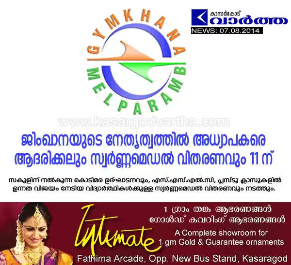 മേല്പ്പറമ്പ്: (www.kasargodvartha.com 08.08.2014) രണ്ട് പതിറ്റാണ്ട് കാലം ചന്ദ്രഗിരി ഗവണ്മെന്റ് ഹയര്സെക്കന്ഡറി സ്കൂളില് സേവനം അനുഷ്ഠിച്ച പൂര്വ്വ അധ്യാപകരെ ജിംഖാന മേല്പ്പറമ്പ് ആദരിക്കുന്നു. സകൂളിന് നല്കുന്ന കൊടിമര ഉദ്ഘാടനവും, എസ്.എസ്.എല്.സി, പ്ലസ്ടു ക്ലാസുകളില് ഉന്നത വിജയം നേടിയ വിദ്യാര്ത്ഥികള്ക്കുള്ള സ്വര്ണ്ണമെഡല് വിതരണവും നടത്തും.