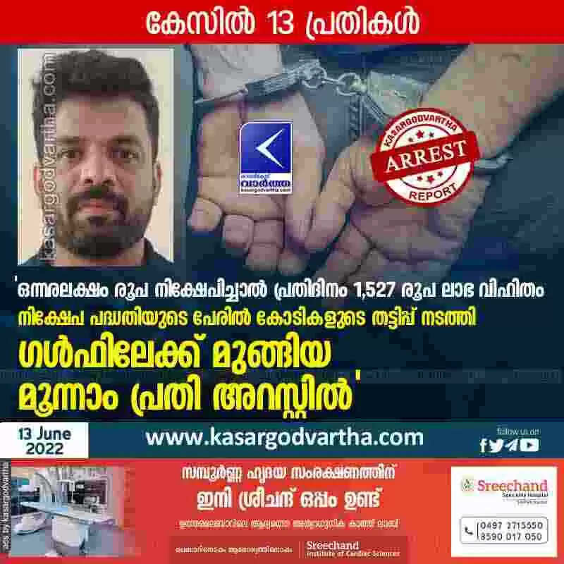 Investment fraud case | 'ഒന്നരലക്ഷം രൂപ നിക്ഷേപിച്ചാൽ പ്രതിദിനം 1,527 രൂപ ലാഭ വിഹിതം; നിക്ഷേപ പദ്ധതിയുടെ പേരിൽ കോടികളുടെ തട്ടിപ്പ് നടത്തി ഗൾഫിലേക്ക് മുങ്ങിയ മൂന്നാം പ്രതി അറസ്റ്റിൽ'