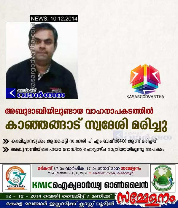 അബുദാബി: (www.kasargodvartha.com 10.12.2014) അബുദാബിയിലെ ഫയാ റോഡില് ചൊവ്വാഴ്ചയുണ്ടായ വാഹനാപകടത്തില് കാഞ്ഞങ്ങാട് സ്വദേശി മരിച്ചു. കാലിച്ചാനടുക്കം ആനപ്പെട്ടി സ്വദേശി പി എം ബഷീര്(40) ആണ് മരിച്ചത്.