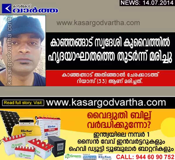 കുവൈത്ത് സിറ്റി: (www.kasargodvartha.com 14.07.2014) കുവൈത്തില് ഹൃദയാഘാതത്തെ തുടര്ന്ന് മലയാളി യുവാവ് മരിച്ചു. കാഞ്ഞങ്ങാട് അതിഞ്ഞാല് ചേരക്കാടത്ത് പരേതനായ കുഞ്ഞബ്ദുല്ലയുടെ മകന് റിയാസ് (33) ആണ് മരിച്ചത്.