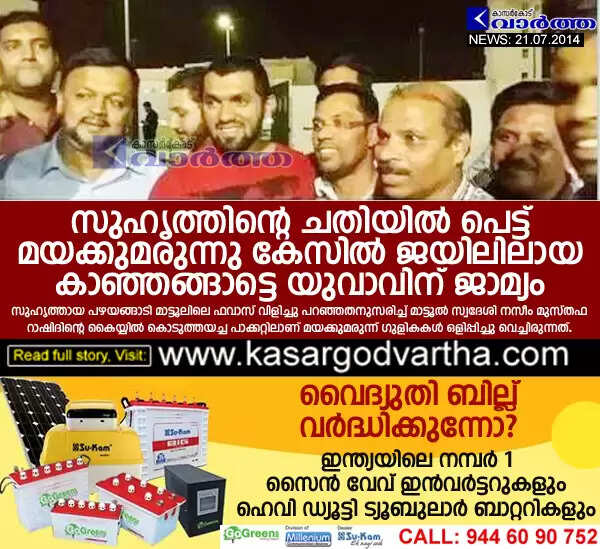സുഹൃത്തിന്റെ ചതിയില് പെട്ട് മയക്കുമരുന്നു കേസില് ജയിലിലായ കാഞ്ഞങ്ങാട്ടെ യുവാവിന് ജാമ്യം