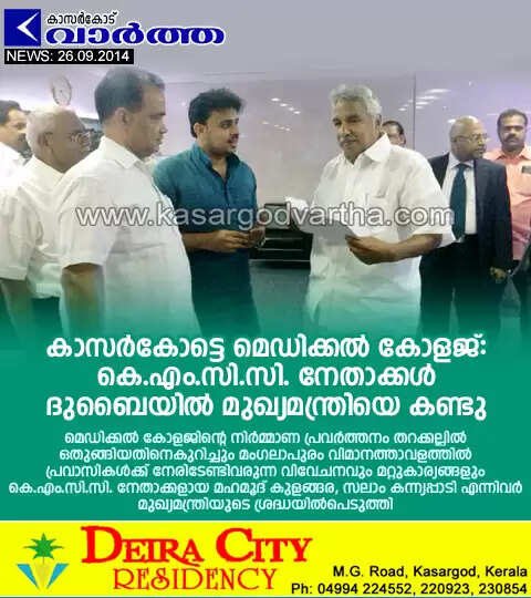 Keywords: Dubai, KMCC, kasaragod, Gulf, Oommen Chandy, Airport, Kasaragod Medical college: KMCC leaders meets CM