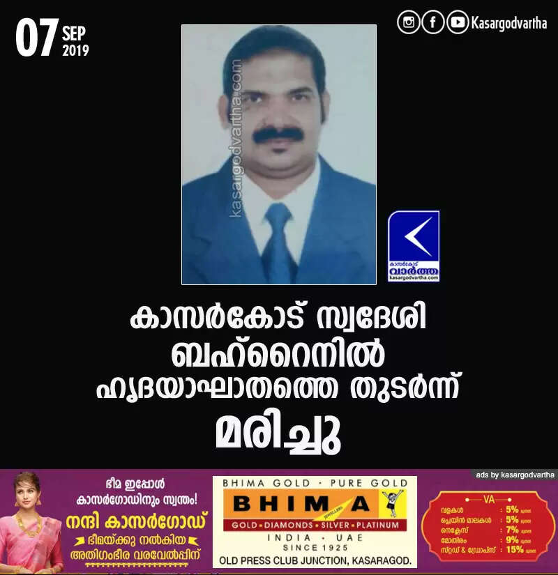 കാസര്കോട് സ്വദേശി ബഹ്റൈനില് ഹൃദയാഘാതത്തെ തുടര്ന്ന് മരിച്ചു