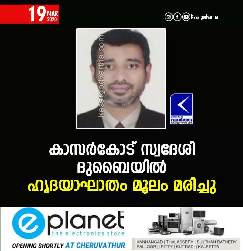 കാസര്കോട് സ്വദേശി ദുബൈയില് ഹൃദയാഘാതം മൂലം മരിച്ചു