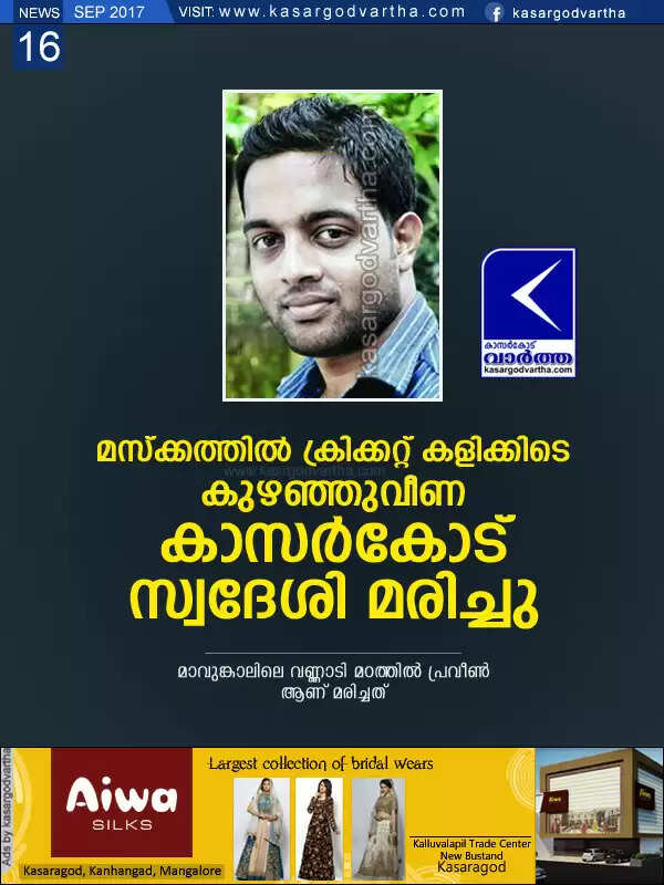 കാഞ്ഞങ്ങാട്: (www.kasargodvartha.com 16.09.2017) മസ്ക്കത്തില് ക്രിക്കറ്റ് കളിക്കിടെ കുഴഞ്ഞുവീണ കാസര്കോട് സ്വദേശി മരിച്ചു. മാവുങ്കാലിലെ വണ്ണാടി മഠത്തില് പ്രവീണ് (31) ആണ് മരിച്ചത്. സെപ്തംബര് എട്ടിനാണ് ക്രിക്കറ്റ് കളിക്കുന്നതിനിടെ മസ്തിഷ്കാഘാതത്തെ തുടര്ന്ന് പ്രവീണ് കുഴഞ്ഞുവീണത്. തുടര്ന്ന് ഖൗല ആശുപത്രിയില് പ്രവേശിപ്പിച്ചതായിരുന്നു.