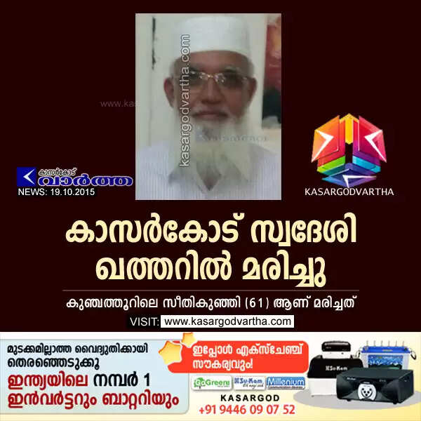 ദോഹ: (www.kasargodvartha.com 19/10/2015) കുഞ്ചത്തൂര് സ്വദേശി ഖത്തറില് മരിച്ചു. കുഞ്ചത്തൂറിലെ സീതികുഞ്ഞി (61) ആണ് മരിച്ചത്. 33 വര്ഷത്തോളമായി ഖത്തര് മുന്സിപ്പാലിറ്റിയില് ജോലിചെയ്തുവരികയായിരുന്നു. ഭാര്യ: മുംതാസ്. മക്കള്: സഹജാസ്, സഹനാസ്, സുനൈനാസ്. മരുമകന്: റഹീം (സൗദി). സഹോദരങ്ങള്: അബ്ദുല്ല മുഹമ്മദ്, ഹനീഫ, അബ്ദുല് ഖാദര്, ഖദീജ, നബീസ, സുലൈഖ, മറിയുമ്മ.