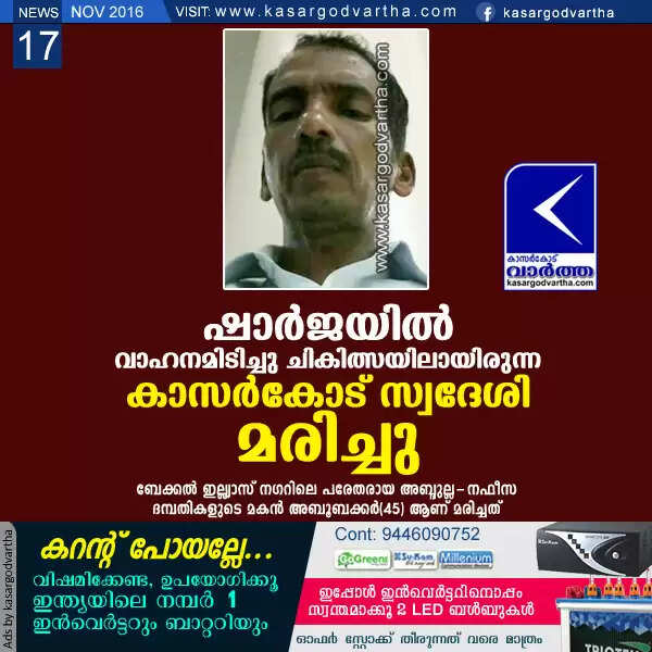 ഷാര്‍ജ: (www.kasargodvartha.com 17.11.2016) ഷാര്‍ജയില്‍ അജ്ഞാത വാഹനമിടിച്ചു ചികിത്സയില്‍ കഴിയുകയായിരുന്ന കാസര്‍കോട് ബേക്കല്‍ സ്വദേശി മരിച്ചു. ബേക്കല്‍ ഇല്ല്യാസ് നഗറിലെ പരേതരായ അബ്ദുല്ല-നഫീസ ദമ്പതികളുടെ മകന്‍ അബൂബക്കര്‍(45) ആണ് മരിച്ചത്. മൂന്നാഴ്ച മുമ്പാണ് അബൂബക്കര്‍ അപകടത്തില്‍ പെട്ടത്. ഷാര്‍ജയില്‍ ചായക്കച്ചവടം നടത്തി വരികയായിരുന്ന അബൂബക്കറിനെ പുലര്‍ച്ചെ അഞ്ജാത വാഹനം ഇടിക്കുകയായിരുന്നു.