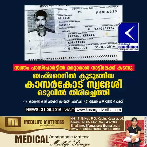 അതിനിടെയാണ് അപരിചിതനായ ഒരാള്‍ ഹരീഷിന്റെ എരിയാലിലുള്ള വീട്ടില്‍ പാസ്‌പോര്‍ട്ട് എത്തിച്ചുകൊടുത്തത്. ഇതോടെ വീട്ടുകാര്‍ ഹരീഷിനെ ബന്ധപ്പെട്ടു. ഹരീഷിന്റെ ആവശ്യപ്രകാരം വീട്ടുകാര്‍ പാസ്‌പോര്‍ട്ട് ബഹ്‌റൈനിലേക്ക് അയച്ചുകൊടുത്തു. ഇത് പരിശോധിച്ചപ്പോവാണ് താന്‍ കബളിപ്പിക്കപ്പെട്ട വിവരം ഹരീഷ് തിരിച്ചറിഞ്ഞത്. താന്‍ ബഹ്‌റൈനില്‍ ഇറങ്ങിയതിന്റെ പിറ്റേദിവസം തന്റെ പാസ്‌പോര്‍ട്ട് ഉപയോഗിച്ച് മറ്റൊരാള്‍ നാട്ടിലേക്ക് പോയതായാണ് പാസ്‌പോര്‍ട്ട് പരിശോധിച്ചപ്പോള്‍ ഹരീഷിന് വ്യക്തമായത്.