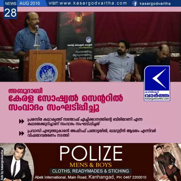 അബുദാബി: (www.kasargodvartha.com 28.08.2016) കേരള സോഷ്യല് സെന്റര് സാഹിത്യ വിഭാഗം സംഘടിപ്പിച്ചുവരുന്ന പ്രതിവാര പരിപാടിയായ ചുറ്റുവട്ടത്തില് പ്രശസ്ത കഥാകൃത്ത് സന്തോഷ് ഏച്ചിക്കാനത്തിന്റെ ബിരിയാണി എന്ന കഥയെക്കുറിച്ച് സംവാദം നടന്നു. പ്രവാസി എഴുത്തുകാരന് അഷ്റഫ് പങ്ങാട്ടയില്, ഖമറുദ്ദീന് ആമയം എന്നിവര് വിഷയാവതരണം നടത്തി.
