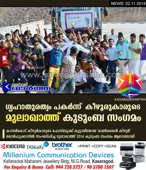 ദുബൈ: (www.kasargodvartha.com 02.11.2014) കാസര്കോട് കീഴൂര്കാരുടെ ഫേസ്ബുക്ക് കൂട്ടായ്മയായ 'ഓണ്ലൈന് കീഴൂര്' ഖോര്ഫുക്കാനില് സംഘടിപ്പിച്ച മുലാഖാത്ത് 2014 കുടുംബ സംഗമം ശ്രദ്ധേയമായി. രാവിലെ 11 മണിക്ക് ദുബൈയില് നിന്ന് ബസ് യാത്രയോടെ തുടങ്ങിയ സംഗമത്തില് സ്ത്രീകളും കുട്ടികളുമടക്കം അമ്പതിലധികം ആളുകള് പങ്കെടുത്തു.