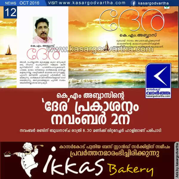 ഷാര്ജ: (www.kasargodvartha.com 12/10/2016) കെ എം അബ്ബാസിന്റെ 'ദേര' എന്ന നോവലിന്റെ പ്രകാശനം ഷാര്ജ രാജ്യാന്തര പുസ്തക മേളയില് നടക്കും. നവംബര് രണ്ടിന് ബുധനാഴ്ച രാത്രി 8.30 മണിക്ക് ലിറ്ററേച്ചര് ഹാളിലാണ് പരിപാടി നടക്കുന്നത്. ദുബൈ മലയാളികളുടെ കഥയാണ് നോവലിന്റെ പ്രമേയം. തൃശൂര് ഗ്രീന് ബുക്സാണ് പ്രസാധകര്.