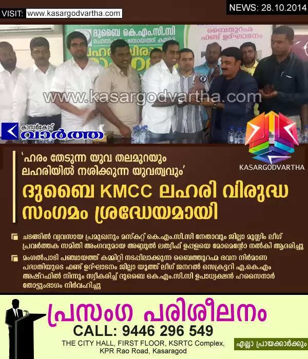 ദുബൈ: (www.kasargodvartha.com 28.10.2014) 'ഹരം തേടുന്ന യുവ തലമുറയും ലഹരിയില് നശിക്കുന്ന യുവത്വവും' എന്ന വിഷയത്തില് ദുബൈ കെ.എം.സി.സി മംഗല്പ്പാടി പഞ്ചായത്ത് കമ്മിറ്റി നടത്തിയ ലഹരി വിരുദ്ധ സംഗമം ശ്രദ്ധേയമായി.