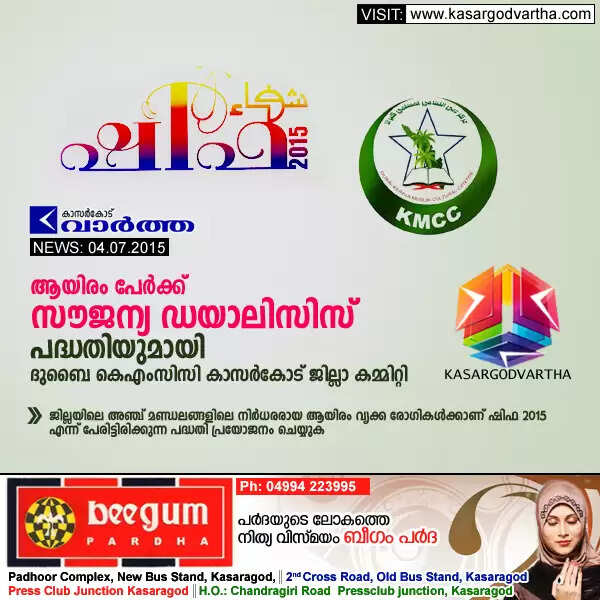 Keywords : Kasaragod, Kerala, KMCC, Dubai, Gulf, Hospital, Treatment, Health, Dialysis, Advertisement Beegum Pardha, KMCC Kasargod District committee free dialysis project for poor.