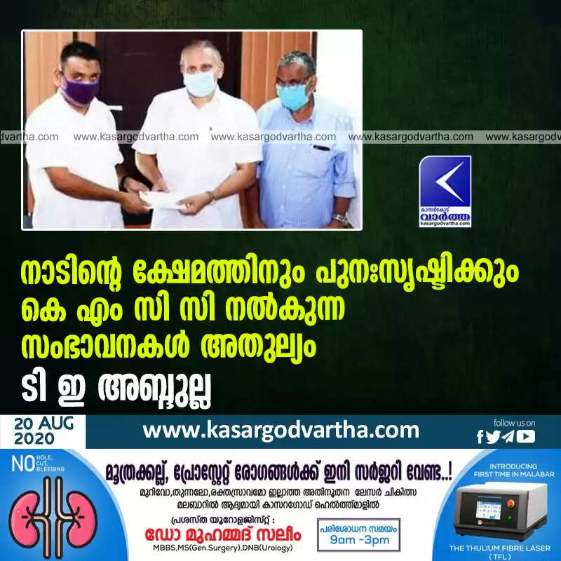 കാസർകോട്: (www.Kasaragodvartha.com 20.08.2020) അശരണരും ആലംബഹീനരുമായ ആളുകളുടെ ആശയും ആശ്രയവുമാണ് കെ എം സി സി എന്ന് മുസ്ലിം ലീഗ് കാസർകോട് ജില്ലാ പ്രസിഡണ്ട് ടി ഇ അബ്ദുല്ല അഭിപ്രായപ്പെട്ടു. കോവിഡ് മഹാമാരി ലോകത്തെയാകമാനം പിടിച്ചുലച്ചപ്പോൾ നാട്ടിലും പ്രവാസ ലോകത്തും ദുബൈ കാസർകോട് ജില്ലാ കെ എം സി സി യുടെ തുല്യതയില്ലാത്ത സേവനങ്ങൾ അഭിനന്ദനാർഹവും അനുകരണീയവുമായിരുന്നു.