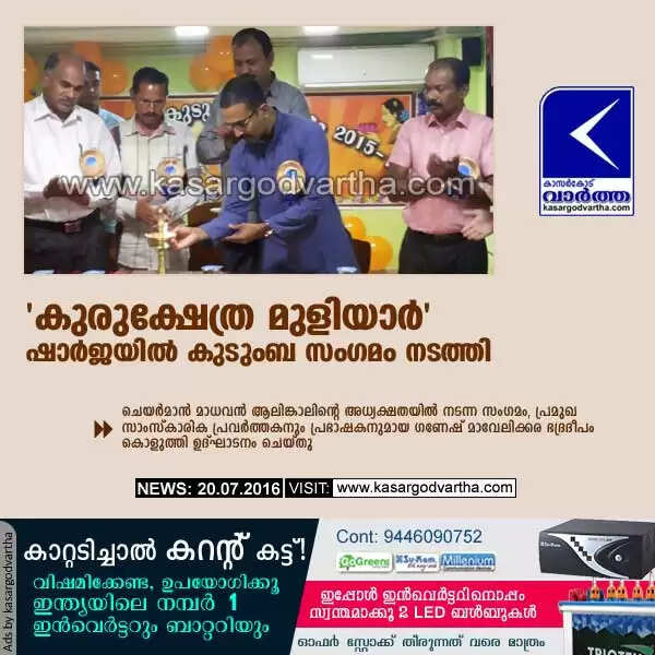 ഷാര്‍ജ: (www.kasargodvartha.com 20/07/2016) മുളിയാര്‍ ശ്രീ സുബ്രഹ്മണ്യസ്വാമി ക്ഷേത്രത്തിന്റെ പരിധിയില്‍ വരുന്ന കലാ - സാംസ്‌കാരിക - കായിക - സാമൂഹിക സേവന പ്രവര്‍ത്തനങ്ങളില്‍ സജീവ സാന്നിധ്യമായ കുരുക്ഷേത്ര മുളിയാര്‍ ഷാര്‍ജയില്‍ കുടുംബ സംഗമം നടത്തി. ചെയര്‍മാന്‍ മാധവന്‍ ആലിങ്കാലിന്റെ അധ്യക്ഷതയില്‍ നടന്ന സംഗമം, പ്രമുഖ സാംസ്‌കാരിക പ്രവര്‍ത്തകനും പ്രഭാഷകനുമായ ഗണേഷ് മാവേലിക്കര ഭദ്രദീപം കൊളുത്തി ഉദ്ഘാടനം ചെയ്തു.