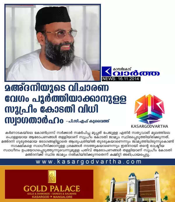 കുവൈത്ത്: (www.kasargodvartha.com 16.11.2014) ബാംഗ്ലൂര് സ്ഫോടനക്കേസിന്റെ വിചാരണ വേഗത്തില് പൂര്ത്തിയാക്കാനും അതുവരെ അബ്ദുല് നാസിര് മഅ്ദനിക്ക് അനുവദിച്ച ജാമ്യം നീട്ടി നല്കാനുമുള്ള സുപ്രീം കോടതി വിധി സ്വാഗതാര്ഹമാണെന്ന് പി.സി.എഫ് കുവൈത്ത് കമ്മിറ്റി അഭിപ്രായപ്പെട്ടു.