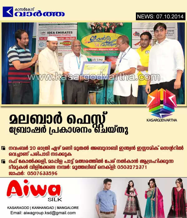 അബുദാബി: (www.kasargodvartha.com 07.10.2014) പയ്യന്നൂര് മണ്ഡലം കെ.എം.സി.സി സംഘടിപ്പിക്കുന്ന മലബാര് ഫെസ്റ്റ് (ത്ത തക്ര്ദാ 2014 ) ബ്രോഷേര് അബുദാബി ഇന്ത്യന് ഇസ്ലാമിക് സെന്ററില് പ്രശസ്ത മാപ്പിള പാട്ട് കലാകാരന് അസീസ് തായിനേരി ഇന്ത്യന് ഇസ്ലാമിക് സെന്റര് പ്രസിഡണ്ട് ബാവ ഹാജിക്ക് നല്കി പ്രകാശനം ചെയ്തു.