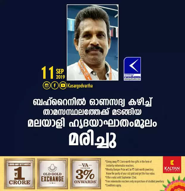 ബഹ്റൈനില് ഓണസദ്യ കഴിച്ച് താമസസ്ഥലത്തേക്ക് മടങ്ങിയ മലയാളി ഹൃദയാഘാതംമൂലം മരിച്ചു