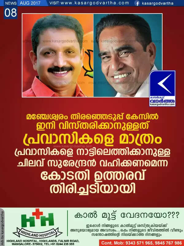 മഞ്ചേശ്വരം തിരഞ്ഞെടുപ്പ് കേസില് ഇനി വിസ്തരിക്കാനുള്ളത് പ്രവാസികളെ മാത്രം; പ്രവാസികളെ നാട്ടിലെത്തിക്കാനുള്ള ചിലവ് സുരേന്ദ്രന് വഹിക്കണമെന്ന കോടതി ഉത്തരവ് തിരിച്ചടിയായി