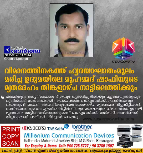 വിമാനത്തിനകത്ത് ഹൃദയാഘാതംമൂലം മരിച്ച ഉദുമയിലെ മുഹമ്മദ് ഷാഫിയുടെ മൃതദേഹം തിങ്കളാഴ്ച നാട്ടിലെത്തിക്കും