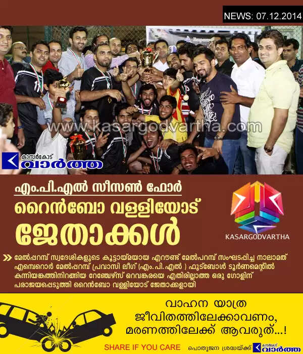 ദുബൈ: (www.kasargodvartha.com 07.12.2014) മേല്‍പ്പറമ്പ് സ്വദേശികളുടെ കൂട്ടായ്മയായ എറൗണ്ട് മേല്‍പറമ്പ് സംഘടപ്പിച്ച നാലാമത് എമ്പെറൊര്‍ മേല്‍പ്പറമ്പ് പ്രവാസി ലീഗ് (എം.പി.എല്‍ ) ഫുട്‌ബോള്‍ ടൂര്‍ണമെന്റില്‍ കന്നിയങ്കത്തിനിറങ്ങിയ റേഞ്ചേഴ്‌സ് ഒറവങ്കരയെ എതിരില്ലാത്ത ഒരു ഗോളിന് പരാജയപ്പെടുത്തി റൈന്‍ബോ വള്ളിയോട് ജേതാക്കളായി.