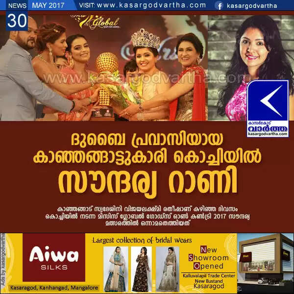 ദുബൈ: (www.kasargodvartha.com 30.05.2017) ലോക സുന്ദരികളുടെ പ്രിയ നാടായ ദുബൈയില് നിന്ന് ഒരു സുന്ദരി കൂടി കേരളത്തില് കിരീടം ചൂടി. മംഗളൂരുവില് സ്ഥിര താമസമാക്കിയ കാഞ്ഞങ്ങാട് സ്വദേശിനി വിജയലക്ഷ്മി രതീഷാണ് കഴിഞ്ഞ ദിവസം കൊച്ചിയില് നടന്ന മിസിസ് ഗ്ലോബല് ഗോഡ്സ് ഓണ് കണ്ട്രി 2017 സൗന്ദര്യ മത്സരത്തില് ഒന്നാമതെത്തിയത്.