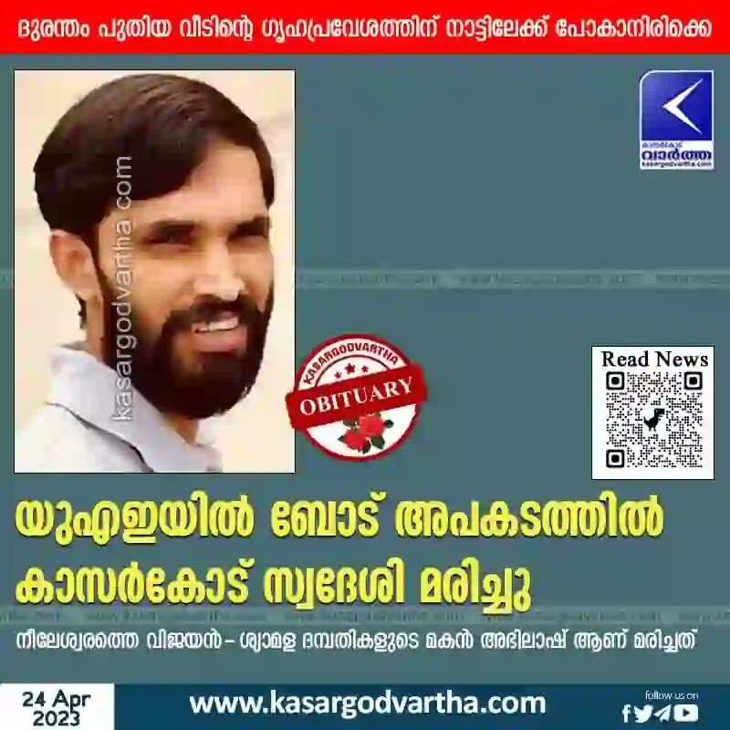 Keywords:  Neeleswaram native died in a boat accident in UAE, Sharjah, Abhilash, Accidental Death, Obituary, Boat Accident, Injured, News, Top-Headlines, Gulf.