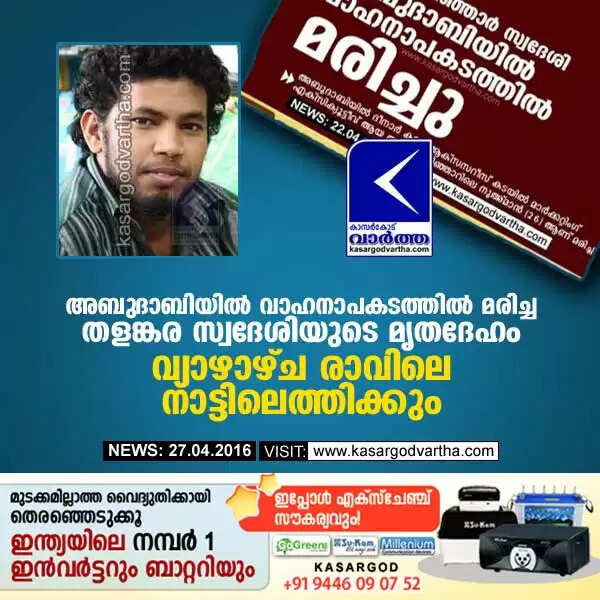 അബുദാബിയില് വാഹനാപകടത്തില് മരിച്ച തളങ്കര സ്വദേശിയുടെ മൃതദേഹം വ്യാഴാഴ്ച രാവിലെ നാട്ടിലെത്തിക്കും