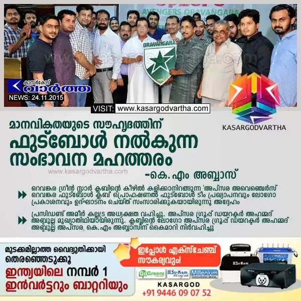 ദുബൈ: (www.kasargodvartha.com 24.11.2015) മാനവിക സൗഹൃദം നിലനിര്ത്തുന്നതില് കായിക വിനോദങ്ങള് നിര്ണായക സ്വാധീനം ചെലുത്തിയിട്ടുണ്ടെന്നും പ്രവാസികളുടെ ഫുട്ബോള് മത്സരങ്ങള് എന്നും നമ്മുടെ നാടിന്റെ ഉത്സവങ്ങളായി മാറുകയാണ് പതിവെന്നും കഥാകൃത്തും ദുബൈയില് സിറാജ് ദിന പത്രം എഡിറ്റര് ഇന് ചീഫുമായ കെ.എം അബ്ബാസ് അഭിപ്രായപ്പെട്ടു. ഒറവങ്കര ഗ്രീന് സ്റ്റാര് ക്ലബ്ബിന്റെ കീഴില് കളിക്കാനിറങ്ങുന്ന 'അപ്സര അവെഞ്ചെര്സ് ഒറവങ്കര ഫുട്ബോള് ക്ലബ്' പ്രൊഫഷണല് ഫുട്ബോള് ടീം പ്രഖ്യാപനവും ലോഗോ പ്രകാശനവും ഉദ്ഘാടനം ചെയ്ത് സംസാരിക്കുകയായിരുന്നു അദ്ദേഹം.