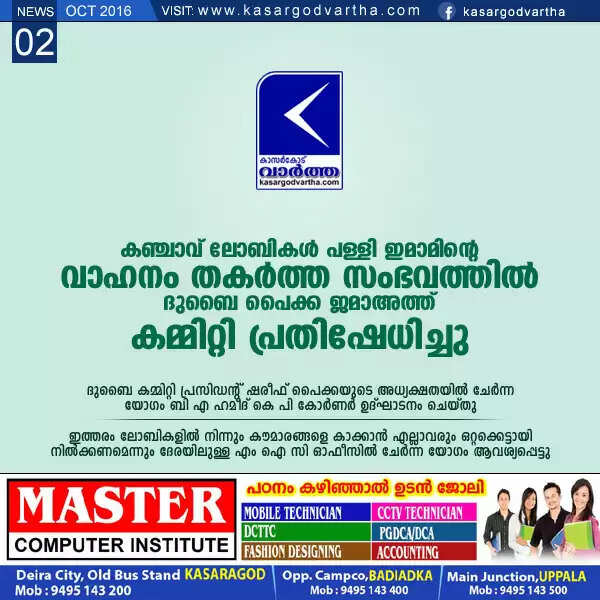 കഞ്ചാവ് ലോബികള് പള്ളി ഇമാമിന്റെ വാഹനം തകര്ത്ത സംഭവത്തില് ദുബൈ പൈക്ക ജമാഅത്ത് കമ്മിറ്റി പ്രതിഷേധിച്ചു