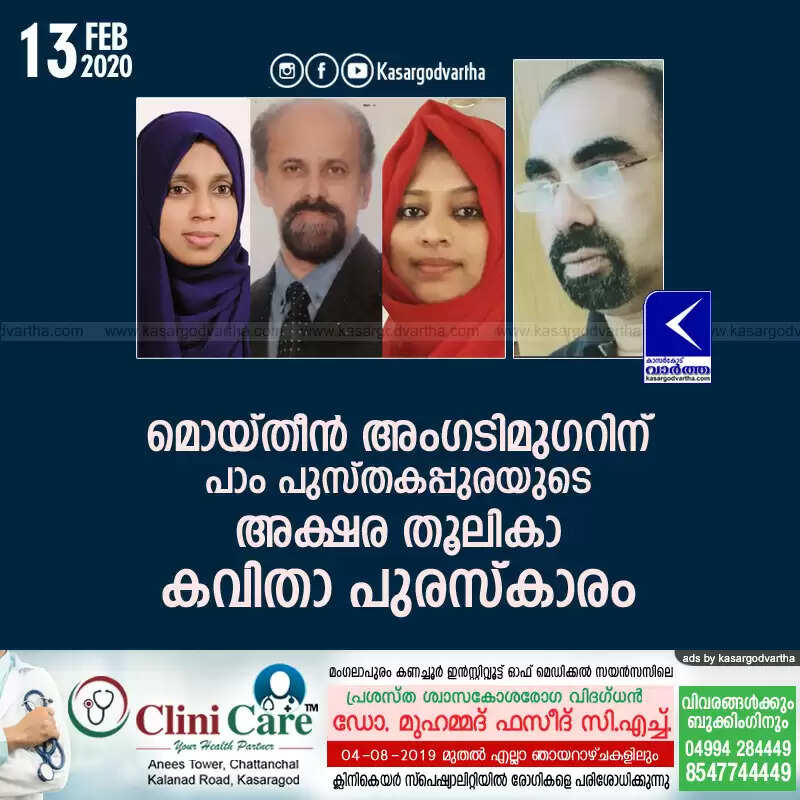 ഷാര്‍ജ: (www.kasaragodvartha.com 13.02.2020)  മൊയ്തീന്‍ അംഗടിമുഗറിന് പാം പുസ്തകപ്പുരയുടെ അക്ഷര തൂലികാ കവിതാ പുരസ്‌കാരം ലഭിച്ചു. സാഹിത്യകാരി കെ പി സുധീര അധ്യക്ഷയും കവികളായ മുരളി മംഗലത്ത്, പി ശിവപ്രസാദ് എന്നിവര്‍ അംഗങ്ങളുമായ ജഡ്ജിംഗ് കമ്മിറ്റിയാണ് പുരസ്‌കാരാര്‍ഹരെ തെരഞ്ഞെടുത്തത്. മൊയ്തീന്‍ അംഗടിമുഗറിന്റെ 'ആത്മഹത്യ ചെയ്ത കര്‍ഷകന്റെ വീട്' എന്ന കവിതയ്ക്കാണ് ഒന്നാം സ്ഥാനം ലഭിച്ചത്. 'അസത്യം' എന്ന കവിതയിലൂടെ ഹുസ്‌ന റാഫി രണ്ടാം സ്ഥാനവും, 'കുഞ്ഞുടലുകളുടെ അമ്മമാര്‍' എന്ന കവിതയുടെ രചയിതാവ് കെ പി റസീന മൂന്നാം സ്ഥാനവും നേടി. ഫിലിപ്പ് സെബാസ്റ്റ്യന്റെ 'നിര്‍ഭയ' എന്ന കവിതയ്ക്ക് പ്രത്യേക ജൂറി പുരസ്‌കാരവും ലഭിച്ചു.
