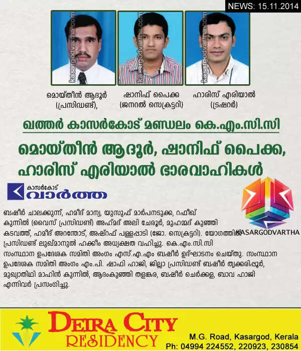ഖത്തര് കാസര്കോട് മണ്ഡലം കെ.എം.സി.സി: മൊയ്തീന് ആദൂര്, ഷാനിഫ് പൈക്ക, ഹാരിസ് എരിയാല് ഭാരവാഹികള്