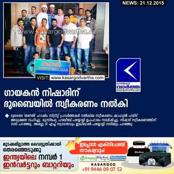 ഗായകന് നിഷാദിന് ദുബൈയില് സ്വീകരണം നല്കി
