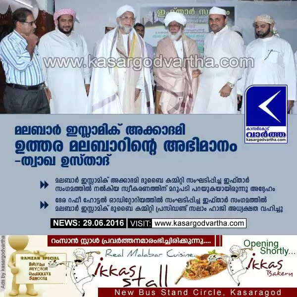 ദുബൈ: (www.kasargodvartha.com 29/06/2016) മൗതഭൗതീക സമന്വയ വിദ്യഭ്യാസത്തോടൊപ്പം സമുന്നത തൊഴില് മേഖലകളിലേക്ക് വിദഗ്ദരെ ഉല്പ്പാദിപ്പിക്കുക വഴി സാമൂഹിക സുരക്ഷിതത്വം കൂടി ഉറപ്പു വരുത്തിക്കൊണ്ട് കാസര്കോട് തലയുയര്ത്തി നില്ക്കുന്ന സ്ഥാപനം ഇന്നാട്ടിലെ ജനങ്ങള്ക്ക് മാത്രമല്ല ഉത്തര മലബാറിന് തന്നെ ഉപകാരപ്രദമാണെന്ന് മലബാര് ഇസ്ലാമിക് കോംപ്ലക്സ് ജനറല് സെക്രട്ടറിയും കീഴൂര് മംഗളൂരു ഖാസിയുമായ ത്വാഖ ഉസ്താദ് അഭിപ്രായപ്പെട്ടു. മലബാര് ഇസ്ലാമിക് അക്കാദമി ദുബൈ കമ്മിറ്റി സംഘടിപ്പിച്ച ഇഫ്താര് സംഗമത്തില് നല്കിയ സ്വീകരണത്തിന് മറുപടി പറയുകയായിരുന്നു അദ്ദേഹം.